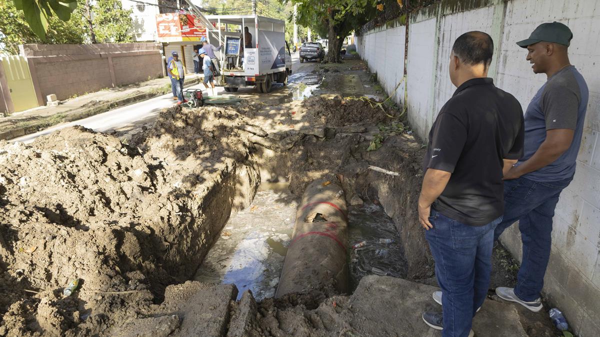 Brigadas de la Corporación del Acueducto y Alcantarillado de Santo Domingo (Caasd) trabajan desde el primer día en la avería próximo a la entrada del residencial Don Honorio.