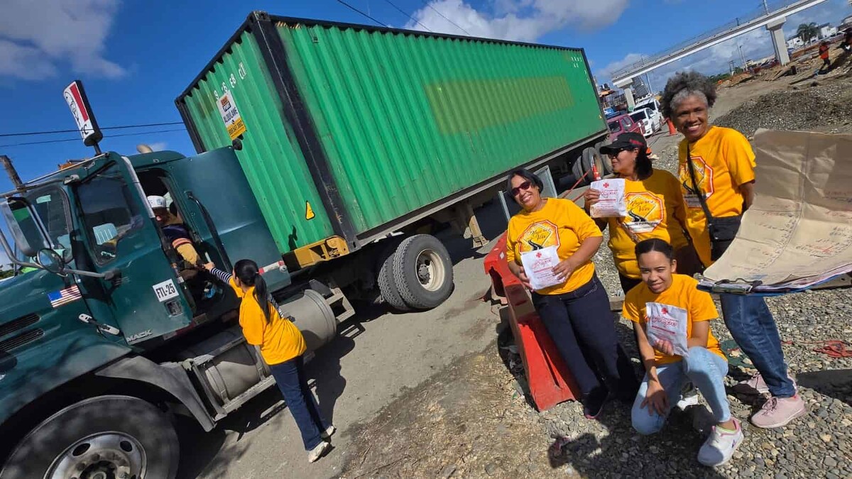 Representantes de Mujeres en la Vía entregan un kit preventivo a un conductor de camión durante la jornada realizada en el kilómetro 9 de la autopista Duarte. (Fuente externa)