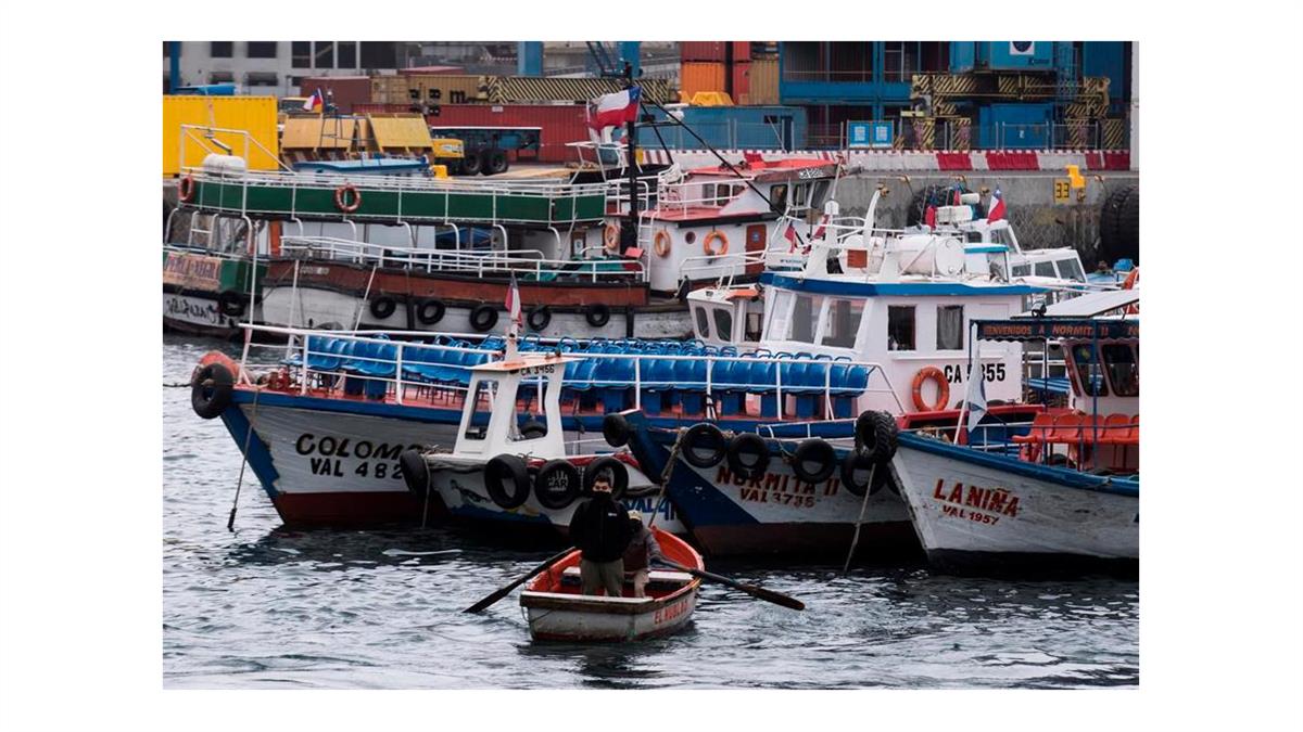 Apoyado en la barandilla del Muelle Prat, Patricio Puyó mira cómo su lancha choca contra otros botes. No la arranca desde marzo, cuando el Gobierno cerró las fronteras y huyeron los pocos turistas que se atrevieron a llegar pese al estallido social.