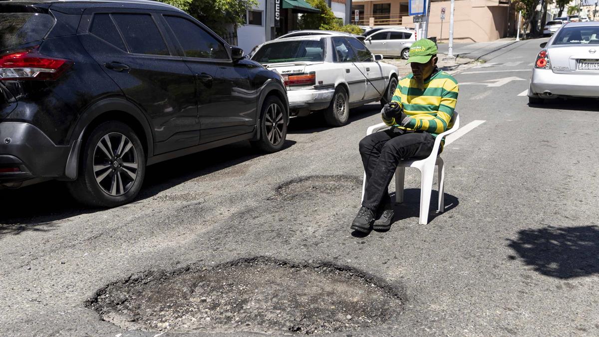 Para transitar por el lugar hay que hacerlo lentamente a causa del deterioro de la calle, justo en el centro, mientras los vehículos se estacionan a ambos lados, en paralelo, dejando un espacio limitado para esquivar el hoyo.