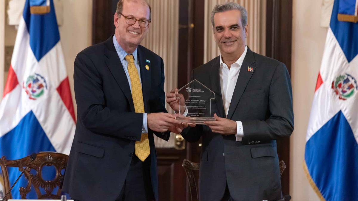 Jonathan Reckford, CEO de Hábitat, entregó al presidente Abinader un reconocimiento durante la actividad celebrada en el salón Las Cariátides.