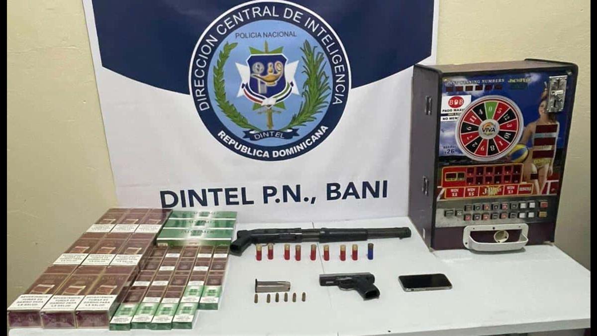 Agentes de la Policía Nacional ejecutaron varios allanamientos en distintos sectores del municipio Baní, resultando detenida una persona y ocupadas varias evidencias, entre ellas armas de fuego, una máquina tragamonedas, un celular y una importante cantidad de cigarrillos de procedencia extranjera.
