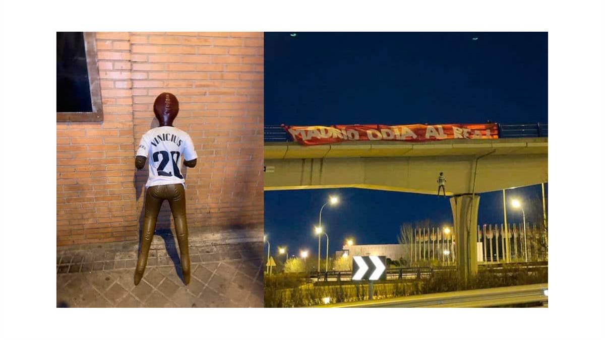 Los perpetradores usaron una imagen negra con la camiseta de Vinicius. El muñeco fue colgado con una soga alrededor de su cuello y una pancarta con la frase "Madrid Odia Al Real".