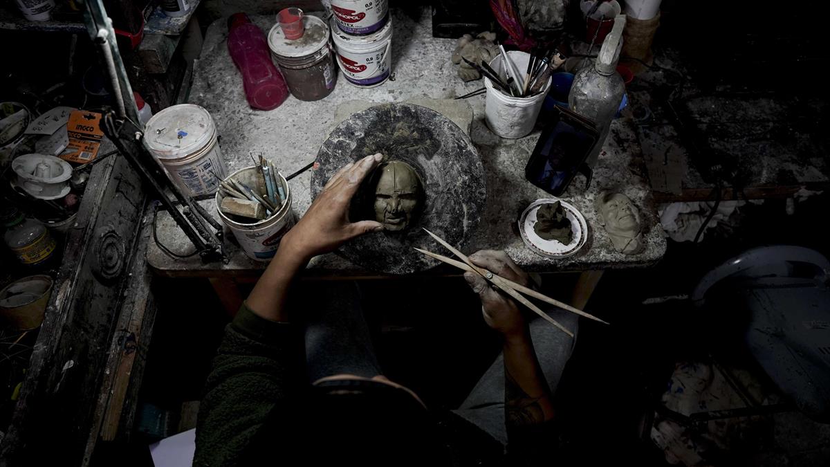El artista inicia el trabajo con un poco de arcilla y va moldeándola con estecas —unas herramientas de plástico que parecen cuchillos con diferentes puntas—, mientras mira desde su celular la foto del difunto para copiar los rasgos.