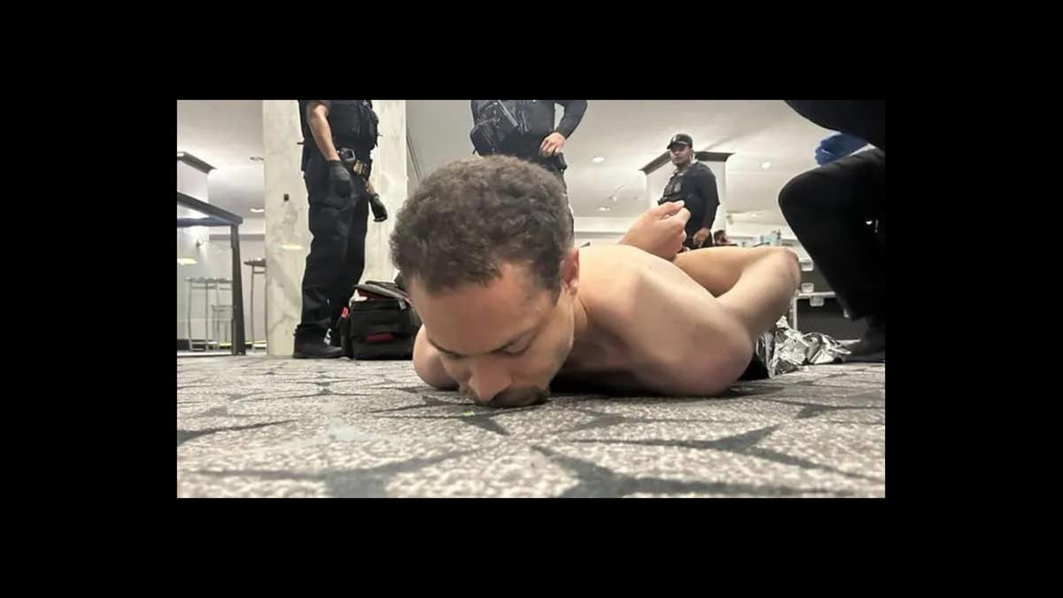 Trump publicó fotos del sospechoso esposado en la alfombra del hotel, sin camisa y tendido boca abajo.