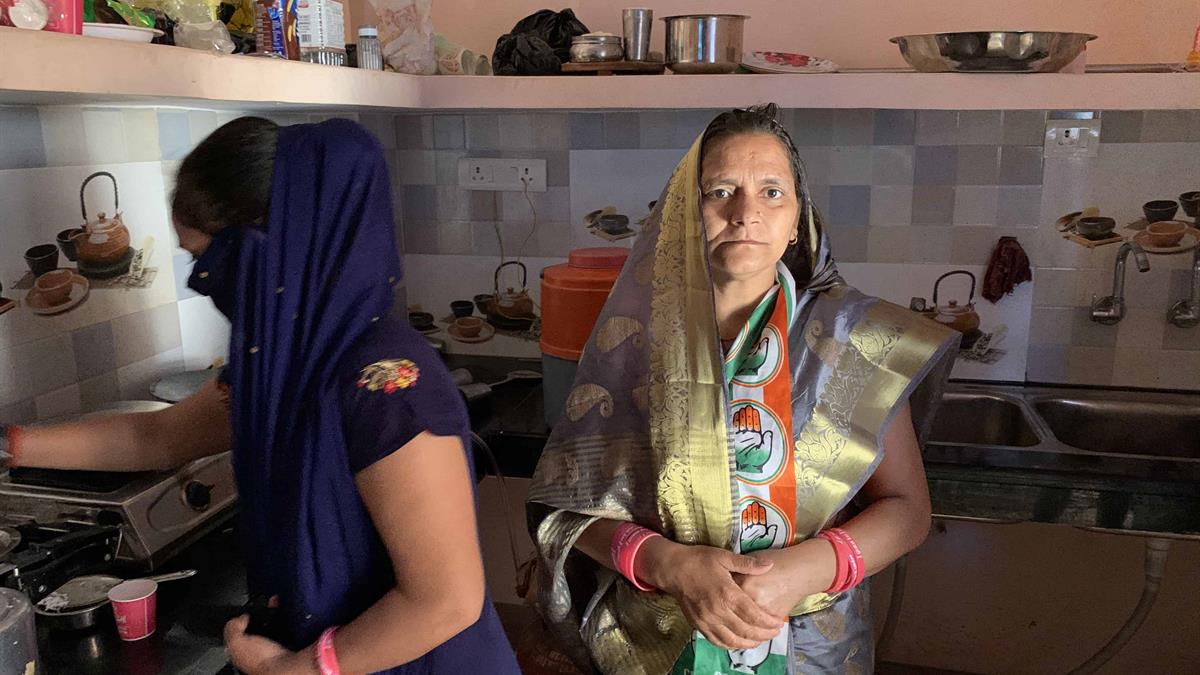 Ataviada con una bufanda con los colores del Partido del Congreso y dos pulseras rosas con la inscripción "soy una mujer, puedo luchar", la candidata de 55 años está acompañada de su hija, que se cubre el rostro con un pañuelo azul.