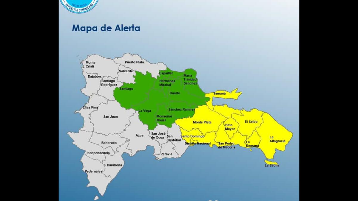 - En tanto, en alerta verde se encuentran María Trinidad Sánchez, Duarte, La Vega, Sánchez Ramírez, Hermanas Mirabal, Espaillat, Santiago y Monseñor Nouel.