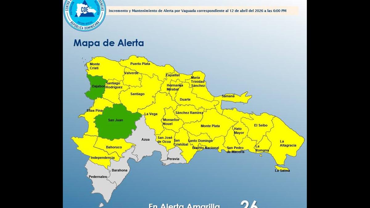 En su boletín de las 6:35 de la tarde, estaban en alerta amarilla, el Distrito Nacional y las provincias Puerto Plata, Espaillat, Hermanas Mirabal, Sánchez Ramírez, Monte Plata, Hato Mayor, Monseñor Nouel, La Vega, Santiago, Santiago Rodríguez, María Trinidad Sánchez, Samaná, San José de Ocoa, Azua, San Juan, El Seib, La Altagracia, Bahoruco, Sánchez Ramírez, Duarte, Independencia, San Cristóbal, Elías Piña, Valverde y Santo Domingo.