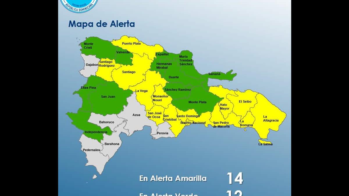 Asimismo, mantiene bajo alerta verde las provincias María Trinidad Sánchez, Monte Plata, Valverde, Hermanas Mirabal, Sánchez Ramírez, Espaillat, Samaná, Montecristi, San Juan, Independencia, Elías Piña y Duarte, especialmente el Bajo Yuna.