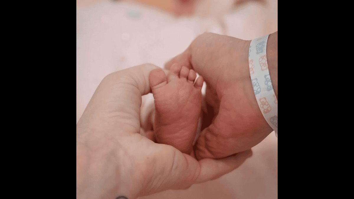 La publicación tiene dos fotografías. Una muestra un pie de la recién nacida agarrado por una mano de cada uno y la otra a ella y a su esposo con la beba mientras la observan tiernamente. Eloísa está vestida de rosa.