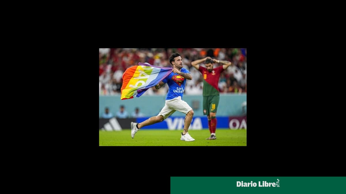 Un aficionado irrumpió en la cancha con la bandera del arcoíris durante el partido entre Portugal y Uruguay en el Mundial, luciendo una camiseta azul de Superman con la frase “SALVEN A UCRANIA”.