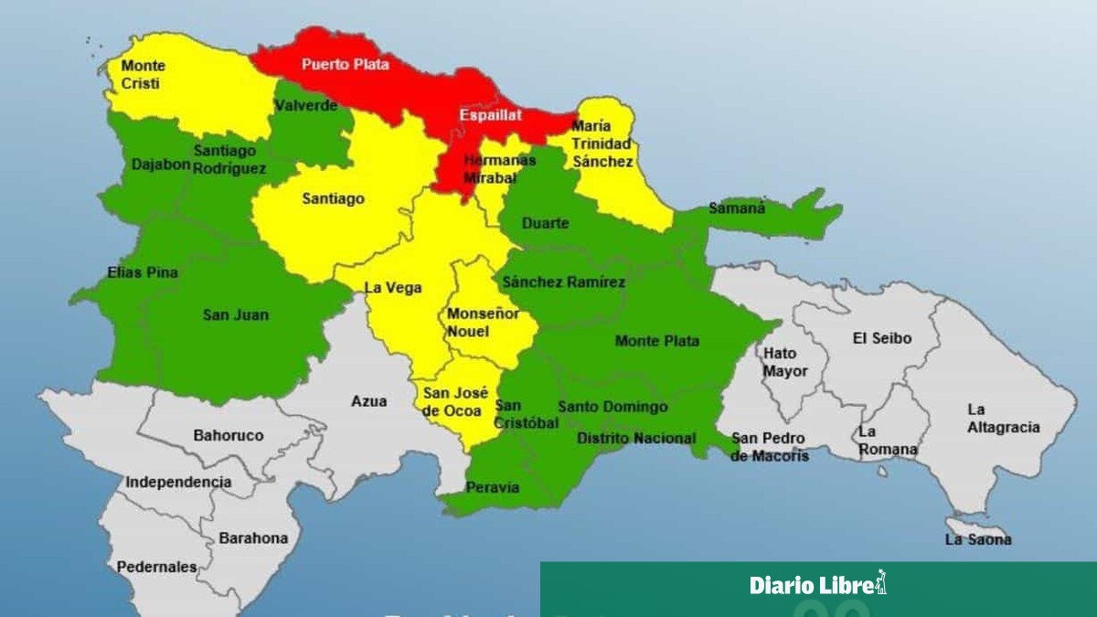 En alerta amarilla se encuentran Montecristi, María Trinidad Sánchez, Hermanas Mirabal, La Vega, Monseñor Nouel, Santiago y San José de Ocoa.