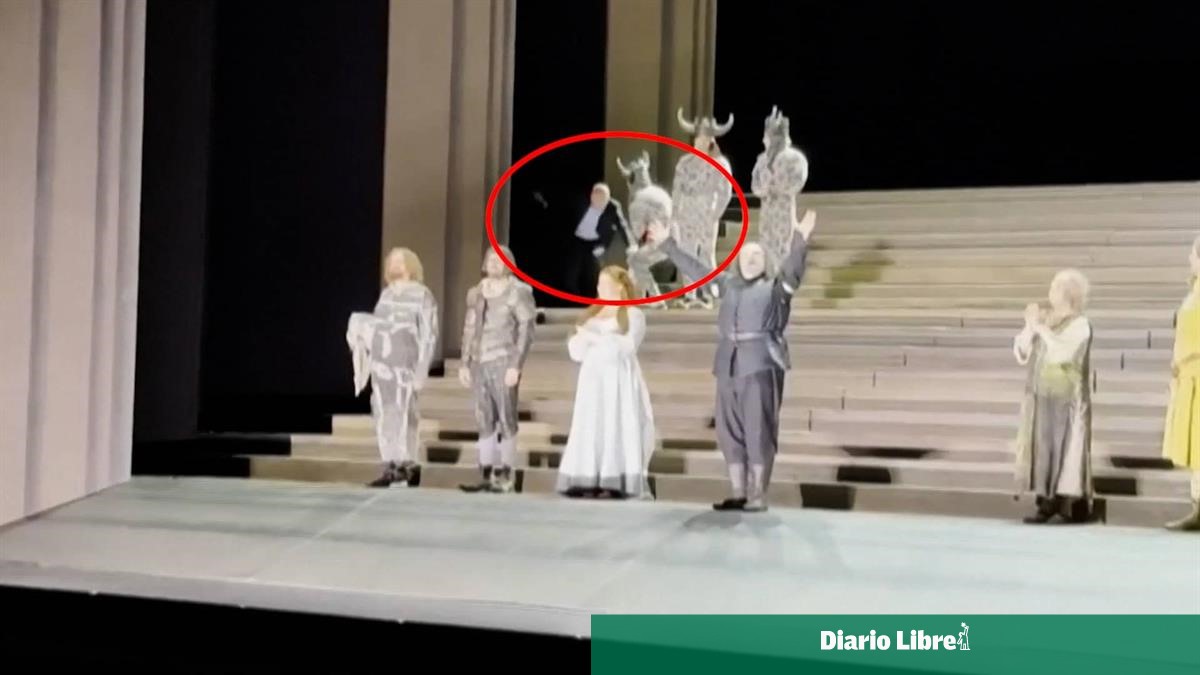 Un funcionario del teatro intenta detener la protesta sin éxito, en un forcejeo que se produce a la vista de parte del público pero pasa desapercibido para los otros artistas en escena.